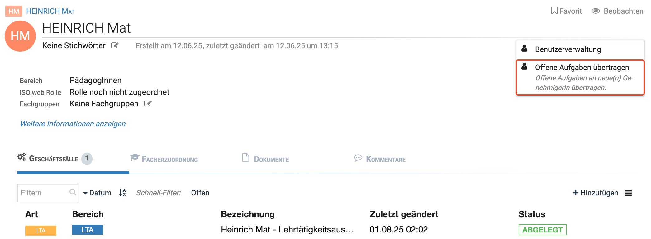 Mit der aktuellen ISO.web-Version ist es nun möglich, offene Aufgaben von vorherigen Schulleitern/Schulleiterinnen zu übernehmen. (Genehmigungen, Stellungnahmen und Kenntnisnahmen bei Anträgen, etc.)