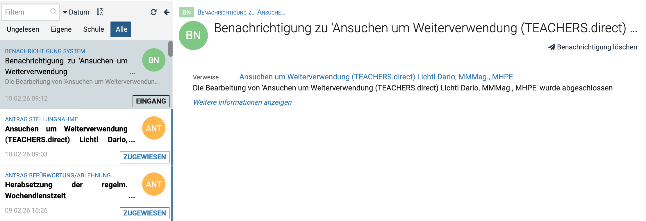 Mit dem neuen Update wird die Schulleitung nun im "Eingang" über den Abschluss eines Antrags seitens der Bildungsdirektion informiert.